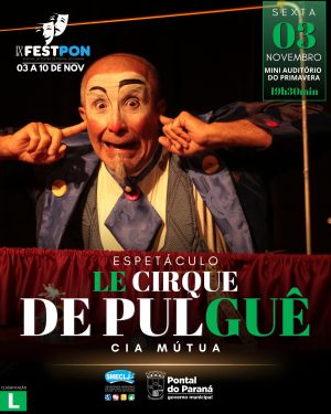 O espetáculo “Le Cirque de Pulguê”, encenado pela Companhia Mútua, de Itajaí-SC, será o primeiro a ser visto pelo público, a partir das 19h30 no auditório da Casa da Cultura (Rua Tom Jobim, 902) no Balneário Primavera.