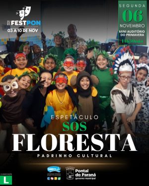 Segunda (6) o espetáculo será “SOS Floresta”, a partir das 14h30, na Casa da Cultura, com o grupo Padrinho Cultural, de Pontal do Paraná.