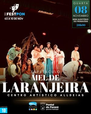 Na quarta (8), às 20h, na Casa da Cultura, tem o espetáculo “Mel de Laranjeira”, com a Companhia Centro Artístico Alldeias, de Curitiba.