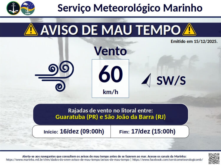 Entre as cidades de Guaratuba (PR) e São João da Barra (RJ) podem ocorrer ventos – de direção sudoeste a sul – e intensidade de até 60 km/h (33 nós), a partir das 9h de terça-feira (16), até {as 15h de quarta-feira (17).