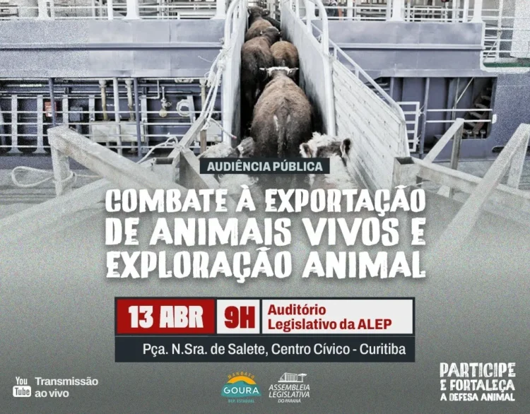 O combate à exportação de animais vivos e à exploração animal será tema de audiência pública no dia 13 de abril (segunda-feira), na Assembleia Legislativa do Paraná (Alep). Proposta pelo deputado estadual Goura (PDT), o debate será realizado no Auditório Legislativo a partir das 9h e será transmitido pelas redes sociais da Alep.