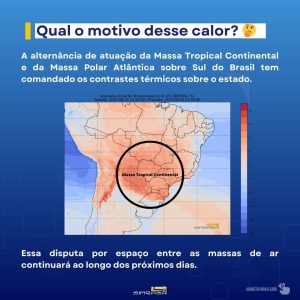 Nesta quinta-feira uma frente fria avança pelo Sul do Brasil, atuando mais diretamente entre o Rio Grande do Sul e Santa Catarina. No Paraná teremos mais um dia de forte calor, mas com maior disponibilidade de umidade em relação aos últimos dias. Nestas condições o risco de tempestades aumenta entre a tarde e noite, principalmente na “metade sul” paranaense.