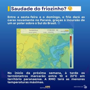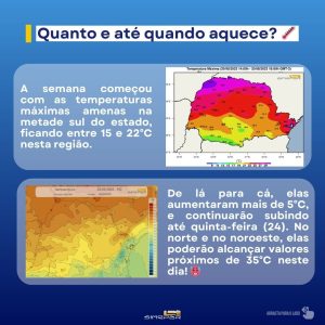Após uma noite quente, o dia começou também começou com temperaturas elevadas na maior parte do Estado. Mas a situação vai mudar bruscamente, avisa o Simepar (Sistema de Tecnologia e Monitoramento Ambiental do Paraná). Confira a previsão para todo o Estado:
