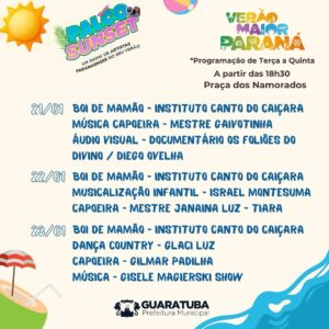 Os shows reúnem rock, samba, sertanejo, MPB, reggae e diversos outros gêneros, além das manifestações culturais de Guaratuba.