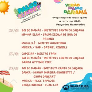 Em Caiobá, os shows de músicos paranaenses acontecem na terça, quarta e quinta. Em Guaratuba, a Secretaria da Cultura e do Turismo ampliou a programação do Governo do Estado (na sexta e sábado), com apresentações dos talentos locais na terça, quarta e quinta.
