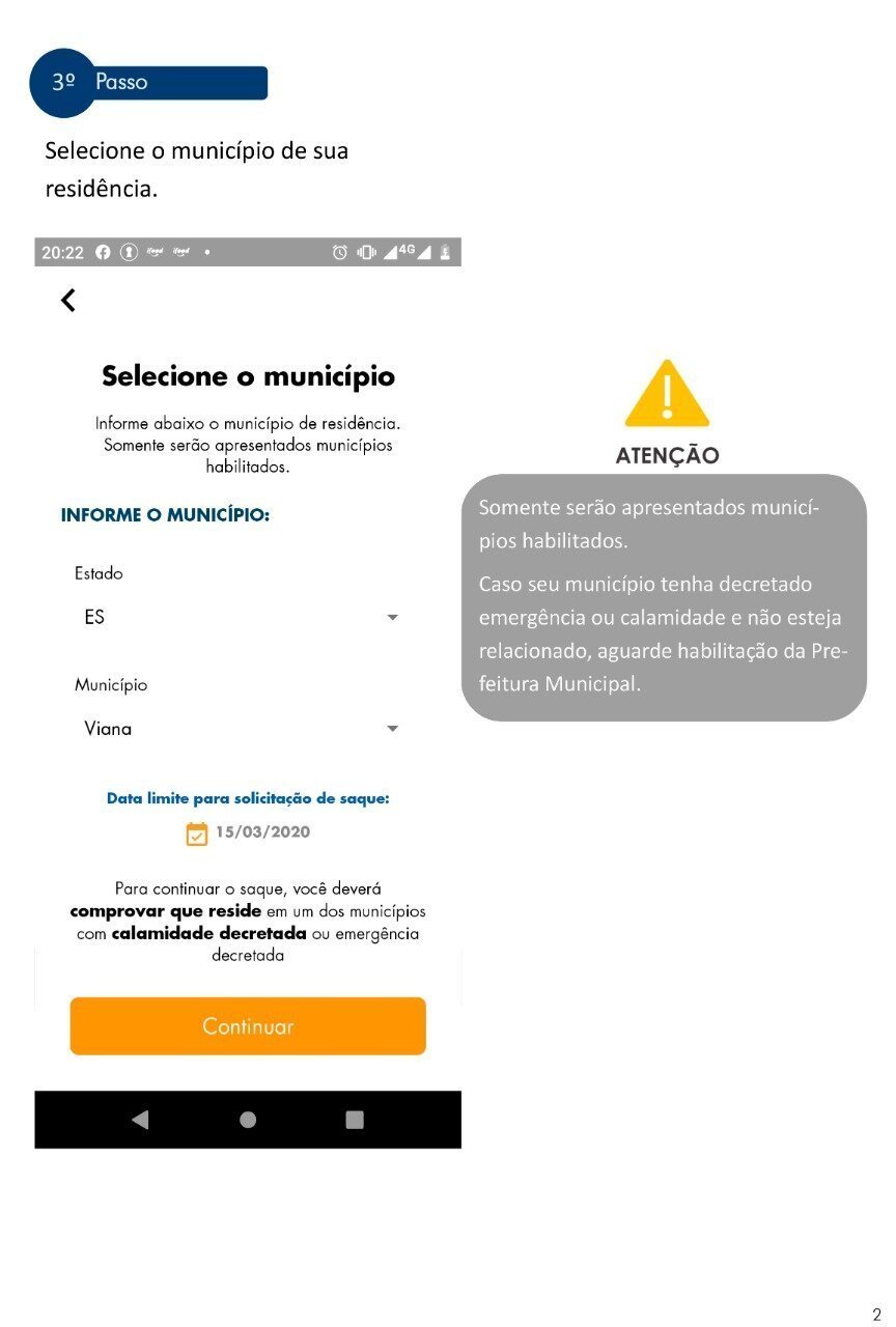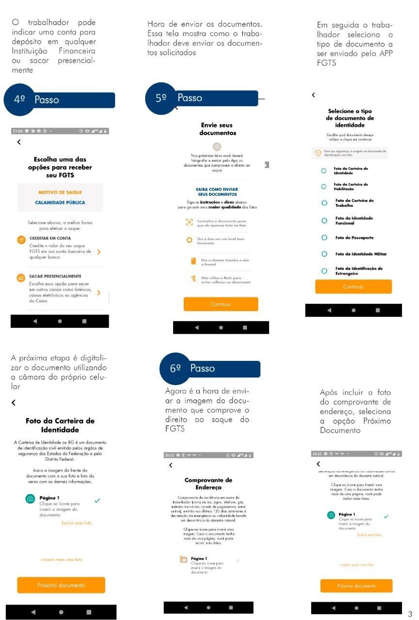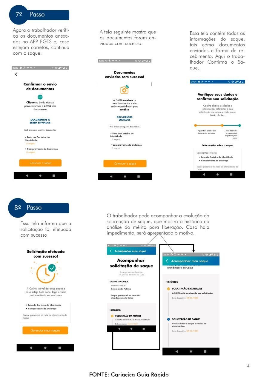 A pessoa que tem direito precisa baixar o aplicativo FGTS da Caixa em seu celular (passo a passo nas imagens). O saque ficará disponível até o dia 25 de outubro.