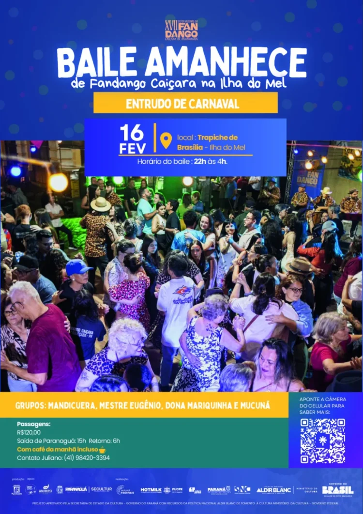 Pela primeira vez, a Ilha do Mel será palco do Baile do Fandango de Paranaguá. No dia 16 de fevereiro, a Associação de Cultura Popular Mandicuera levará à ilha o “Entrudo de Carnaval – Baile Amanhece de Fandango Caiçara”.