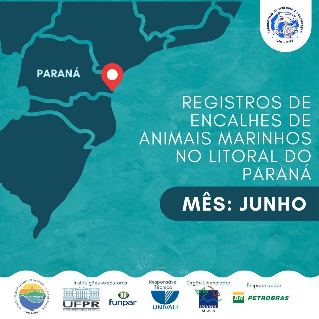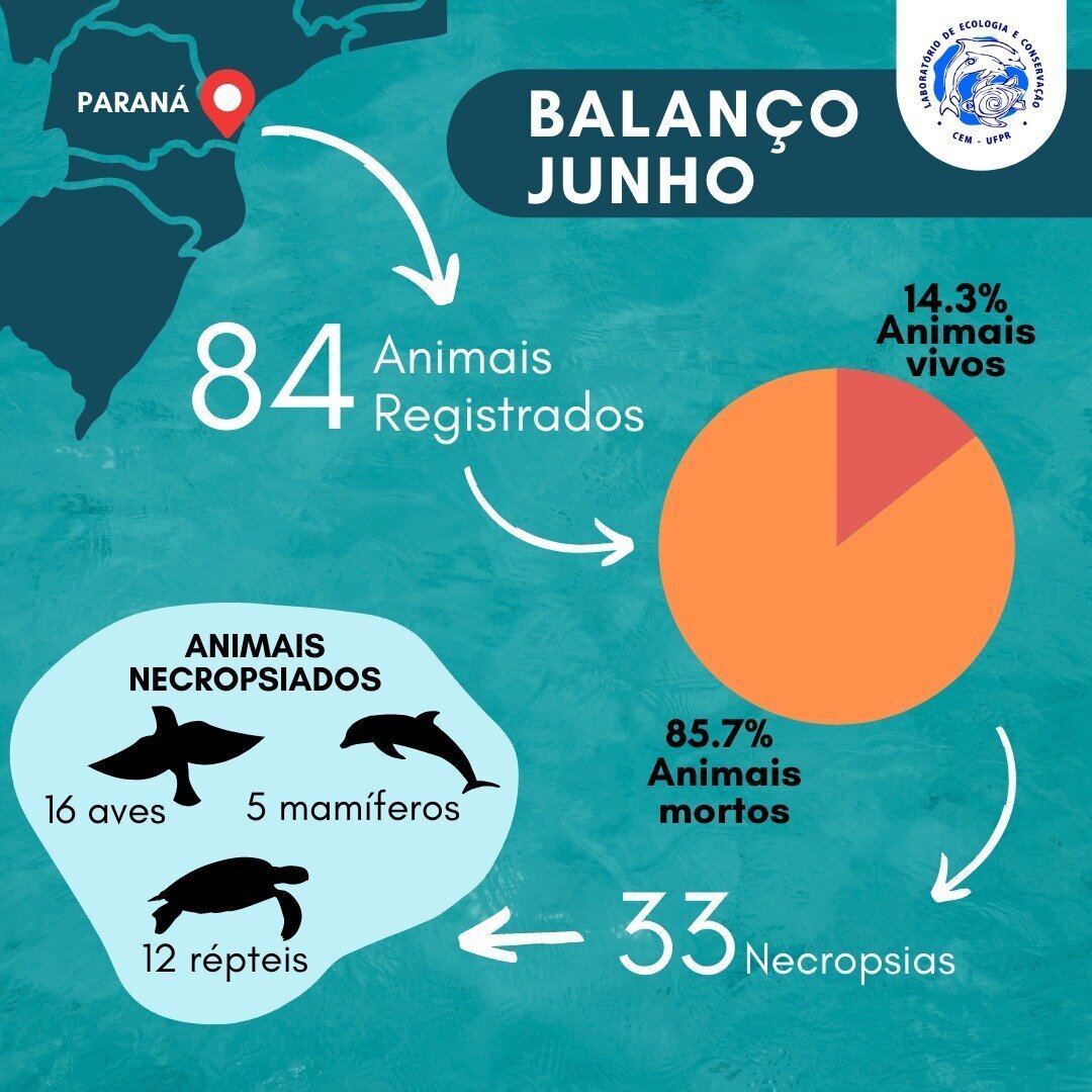 A equipe do Laboratório de Ecologia e Conservação da UFPR (LEC-UFPR) atendeu no mês 46 acionamentos de moradores locais que resultaram em 20 encalhes registrados. Foram realizadas 33 necropsias, com destaque para uma baleia jubarte encalhada na ilha do Superagui, um lobo-marinho-do-sul , 12 tartarugas-verdes e três botos-cinzas.