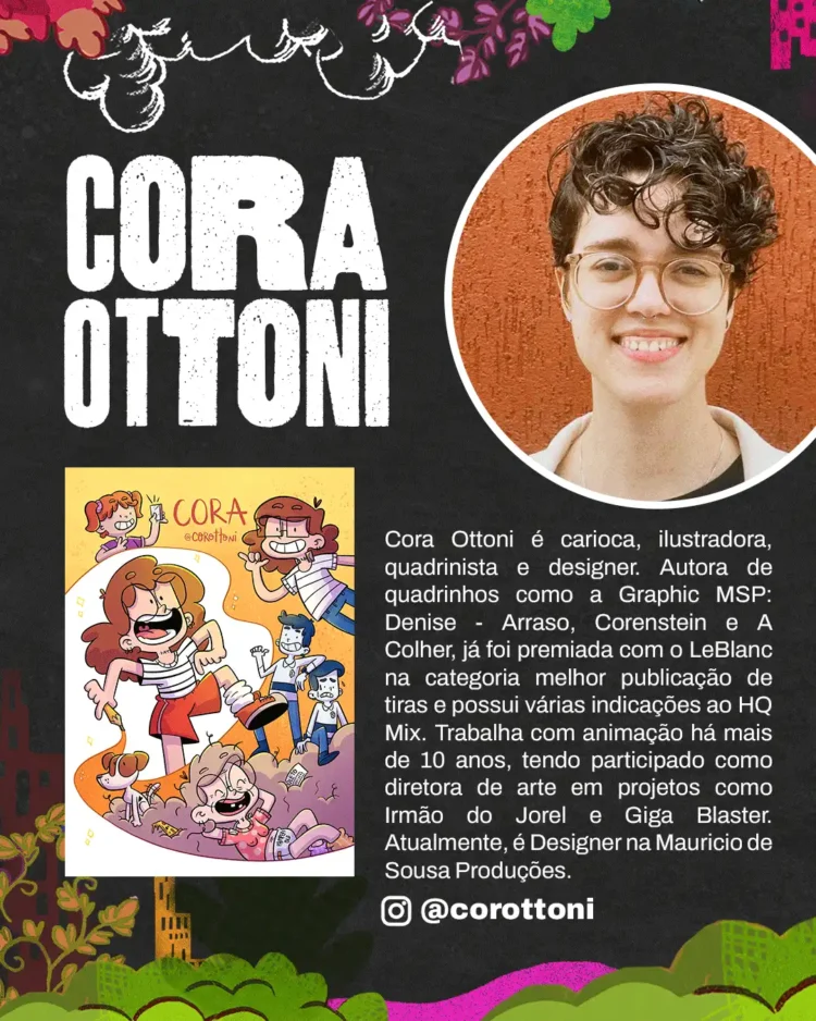 Introdução à produção de quadrinhos – do planejamento à publicação, com Cora Ottoni Uma oficina introdutória voltada para quem quer entender o processo de produzir e publicar seus próprios quadrinhos. Serão abordados temas como: organização financeira, cronogramas, autopublicação, redes sociais, divulgação e participação em eventos.