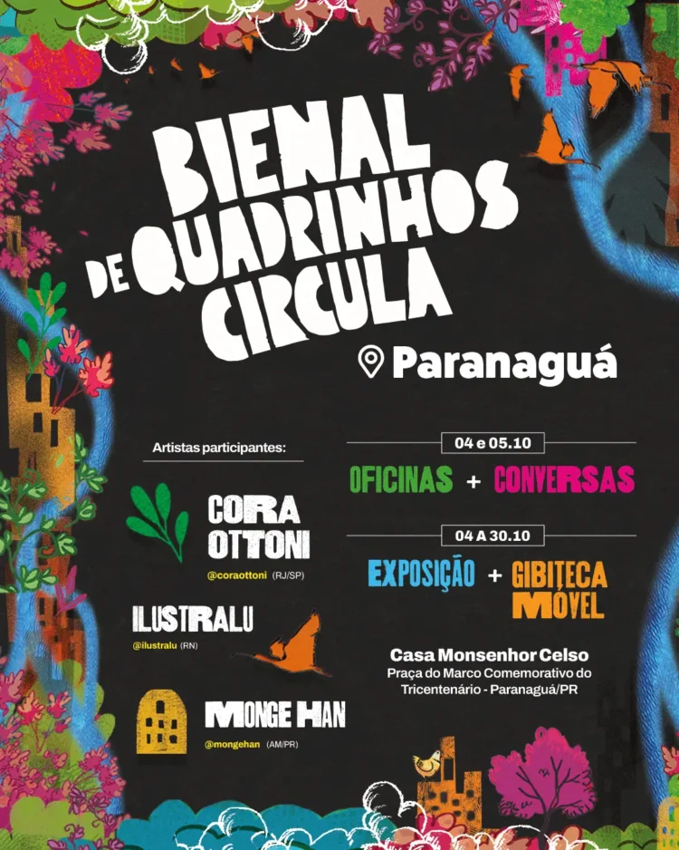 Depois do sucesso da sua 8ª edição, que aconteceu no Museu Oscar Niemeyer e em diversos espaços culturais de Curitiba, e da etapa da Bienal Circula em Foz do Iguaçu, a Bienal de Quadrinhos aporta em Paranaguá nos dias 4 e 5 de outubro (sábado e domingo), para na sequência chegar a Pato Branco (8, 9 e 10 de outubro). As ações em diferentes cidades do Paraná fazem parte da Bienal Circula, promovida pelo Programa Estadual de Fomento e Incentivo à Cultura da Secretaria de Estado da Cultura, com apoio da Copel, da Randon RodoParaná e do Grupo Timber.