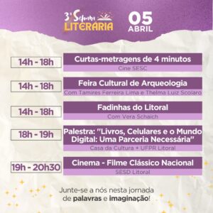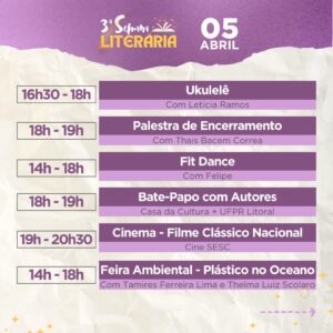 Prossegue em Matinhos a 3ª Semana Literária. O evento acontece até sábado (6), na Arena Gurski. Confira a programação desta sexta-feira: