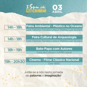 Prossegue nesta quarta-feira (3), na Arena Gurski, a 3ª Semana Literária de Matinhos. Confira a programação: