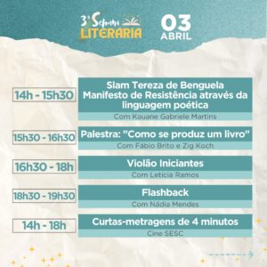 A Semana Literária também terá oficinas, contação de histórias, pintura facial e palestras sobre diversos temas, incluindo técnicas de escrita.