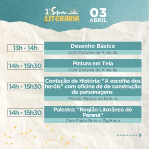 Das 18h às 19h, estão previstas palestras para todas as idades, seguidas por bate-papos com autores de Matinhos e municípios vizinhos, destacando jovens talentos literários.