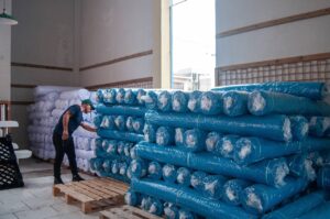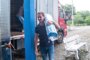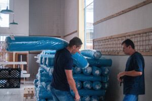 O prefeito Rudão Gimenes fez questão de conferir a qualidade dos tecidos (nas cores branco e azul royal) e até ajudou a descarregar, junto com a equipe do Provopar e do Escritório de Compras Públicas.