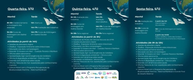 Programação sujeita a alterações. Confira no link oficial do evento: https://labmovel.ufpr.br/feira-de-ciencias/xiv-feira-regional-de-ciencias-do-litoral-do-parana-versao-2025/