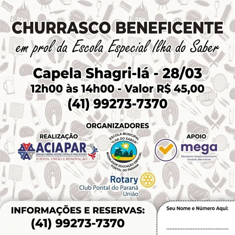 Na ocasião também estará ocorrendo o Churrasco Beneficente em prol da Escola Especial Municipal Ilha do Saber, realizado pela Aciapar de Pontal do Paraná, o Rotary Club Pontal do Paraná, a Escola Especial Ilha do Saber, com apoio do Mega. O churrasco custa R$ 45 reais e pode ser reservado no contato (41)99273-7370.