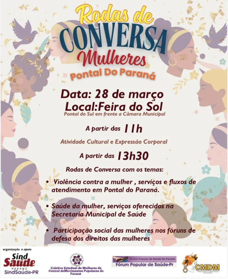 As rodas são uma realização do SindSaúde, o Conselho Estadual das Mulheres da Central dos Movimentos Populares do Paraná, o Fórum Popular de Saúde do Paraná (FOPS) com apoio Conselho Municipal dos Direitos das Mulheres de Pontal do Paraná.