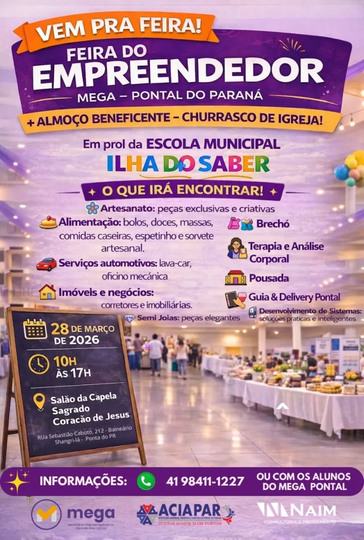 A Feira do Empreendedor será realizada na Capela do Sagrado Coração de Jesus no balneário Shangri-lá, das 10h as 17h. A feira terá uma variedade de produtos e serviços. Haverá brechó, papelaria criativa, artesanato, bolos, massas congeladas, produtos personalizados, sorvetes e demais serviços. A feira é uma realização do Movimento Empreendedorismo Gerando Alternativas (Mega), da Associação Comercial, Industrial e Agrícola (Aciapar) de Pontal do Paraná e da Naim Consultoria e Treinamento com apoio da Comunidade da Capela do Sagrado Coração de Jesus de Shangri-lá.