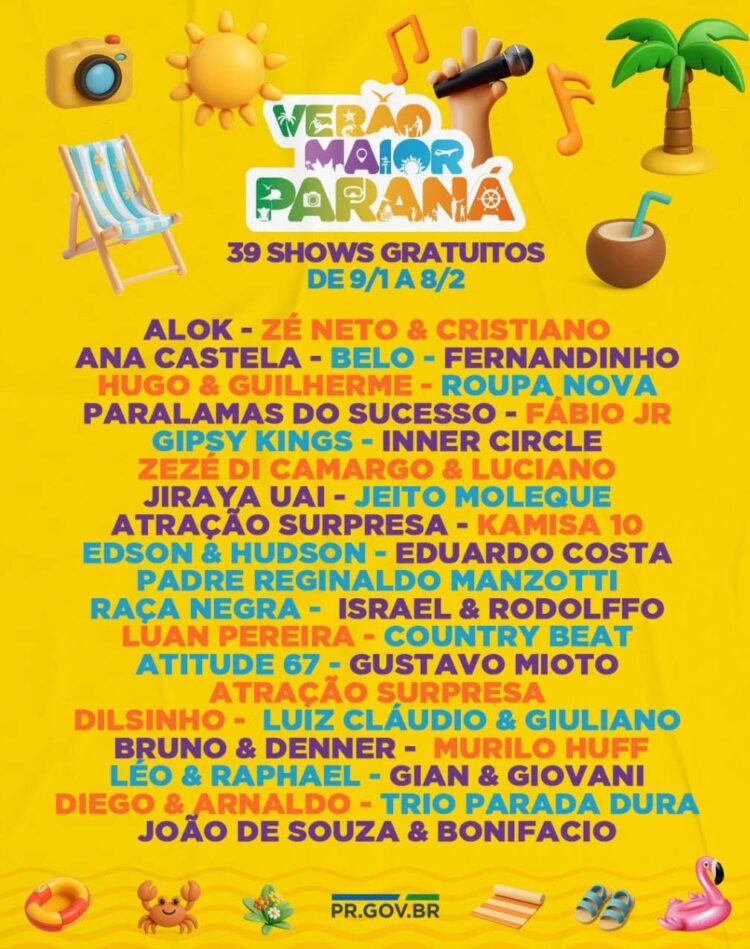 O Governo do Paraná anunciou nesta terça-feira (21) os nomes das atrações do Verão Maior Paraná 2026. São cinco finais de semana seguidos de espetáculos gratuitos, de 9 de janeiro a 8 de fevereiro. Entre as novidades estão shows nas quintas-feiras, atrações internacionais e palcos que devem ser maiores do que no ano passado. Os shows acontecerão nas praias de Matinhos e Pontal do Paraná e terão transmissão do SBT, Band, TVCI, Banda B e TV Paraná Turismo para todo o Brasil.