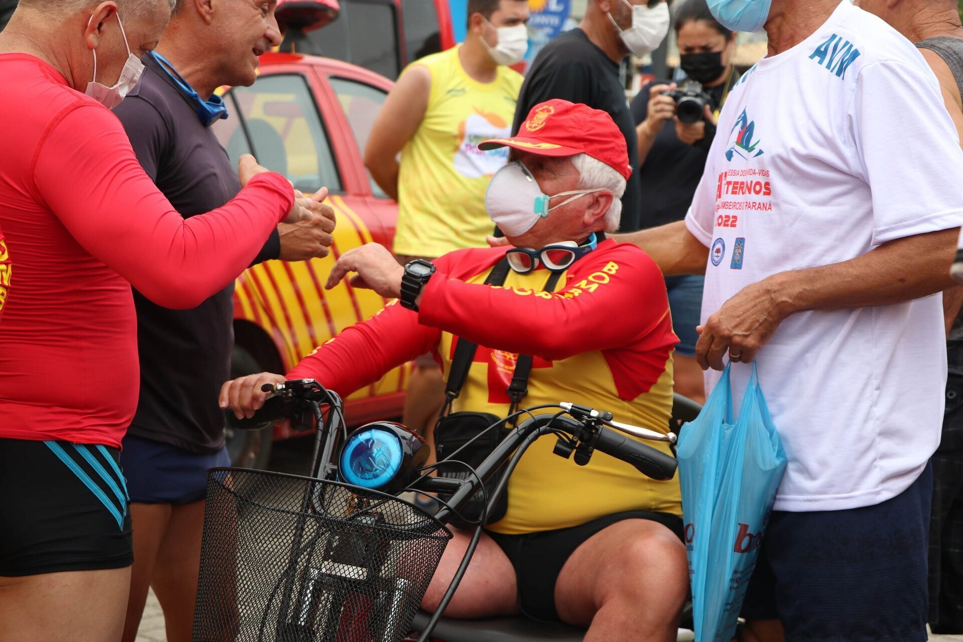 SUPORTE – O 8° GB disponibilizou motos aquáticas, guarda-vidas com cinto de salvamento aquático e nadadeiras para proporcionar mais segurança para os guarda-vidas veteranos. “Eles aguardam ansiosamente pela Travessia e o Corpo de Bombeiros atua na prevenção para proporcionar mais segurança para esses guarda-vidas veteranos que tanto fizeram pelos banhistas durante anos de trabalho”, disse a porta-voz do Corpo de Bombeiros da operação Verão Paraná – Viva a Vida 2021/2022 Costa Leste, tenente Ana Paula Inácio de Oliveira Zanlorenzzi.