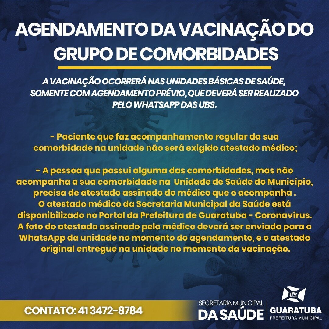Em Guaratuba, a vacinação contra covid-19 para as pessoas com comorbidades ocorrerá nas unidades básicas de saúde, somente com agendamento prévio, que deverá ser realizado pelo whatsapp da UBS.