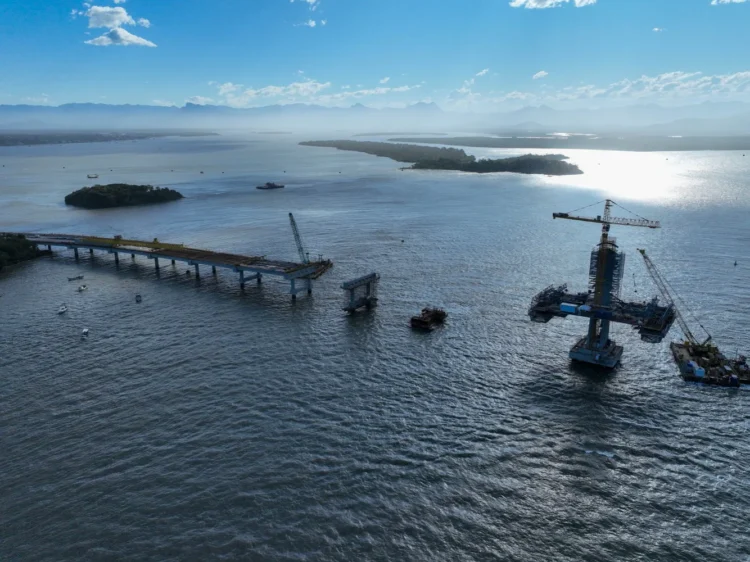 OBRA EM RITMO ACELERADO – Com mais de 70% de execução, a Ponte de Guaratuba deve ser entregue em abril de 2026. São mais de 900 profissionais atuando em regime contínuo para erguer a estrutura de 1.244 metros de extensão, com quatro faixas de tráfego, duas faixas de segurança, ciclovia e calçadas. O investimento total é de cerca de R$ 400 milhões.