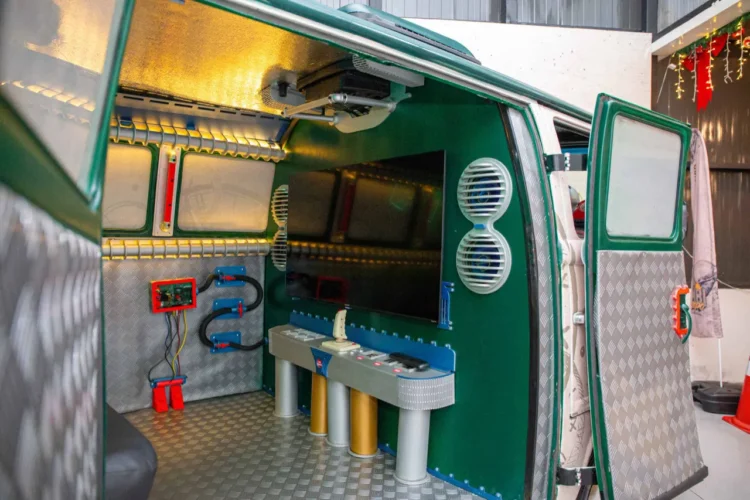 Instalada dentro do Mercado Público, ao lado do palco interno, a Kombi cenográfica funciona como uma cápsula do tempo. Ao entrar no veículo, o visitante é conduzido por uma narrativa audiovisual que mistura ficção e registros históricos, com imagens reais da construção da usina, cenas da antiga COBAL e efeitos especiais que ampliam a sensação de imersão.