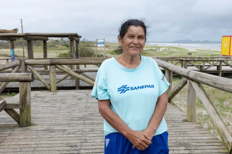 Quem observa a areia limpa muitas vezes não imagina as histórias de quem realiza o serviço. É o caso de Rosemari dos Santos, 68 anos, conhecida carinhosamente como “Rosemari da Xepa”. Moradora de Pontal do Paraná, ela atua no projeto há dez anos e hoje supervisiona uma equipe de 17 pessoas.