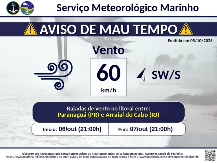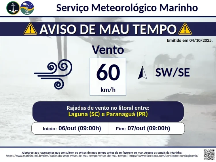 De acordo com os alertas, a passagem de uma frente fria poderá afetar a faixa litorânea de Santa Catarina e do Paraná, entre as cidades de Laguna (SC) e de Paranaguá (PR), com ventos de direção sudoeste a sudeste e intensidade de até 60 km/h (33 nós) entre as manhãs e segunda (6) e as 21h terça (7).
