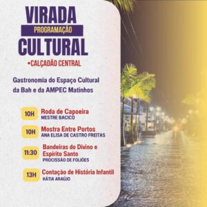 A Prefeitura de Matinhos promove, neste sábado (1º), a partir das 10h, a Virada Cultural de Matinhos. Haverá shows, exposições, oficinas e feira.