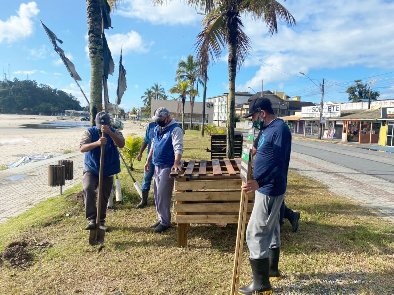 Uma caixa construída com reaproveitamento de paletes para serem colocadas os resíduos. A destinação começa com os caminhões da coleta seletiva que levam os materiais ao barracão administrado pela Associação de Catadores de Materiais Recicláveis – Acamares Pôr-do-Sol. Os caminhões também fazem a coleta dos materiais recicláveis que os pescadores encontram na praia e recolhem em sacolas destinadas para isto.