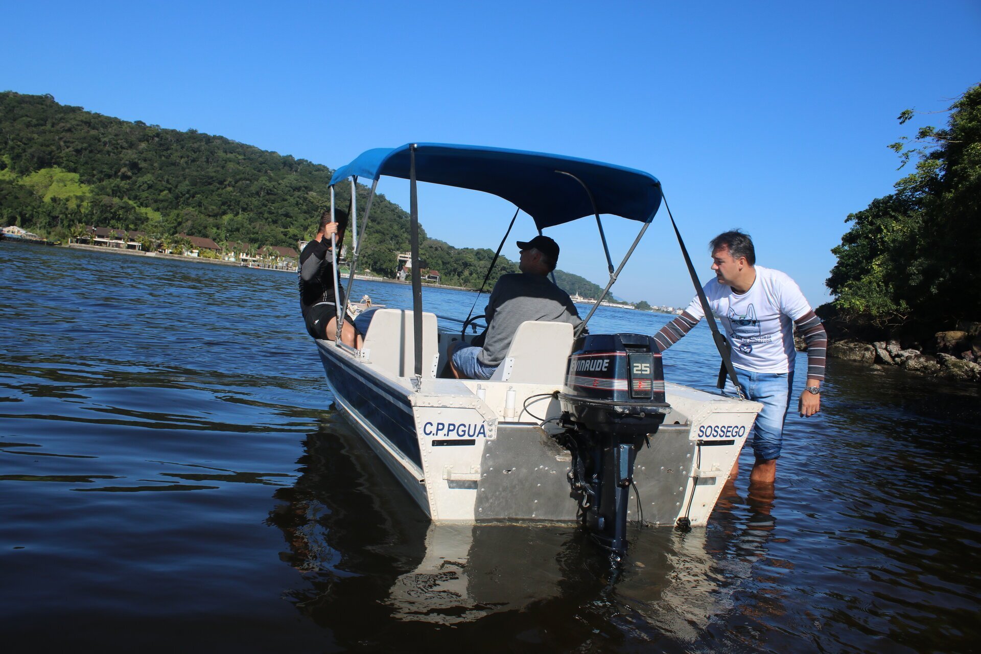 Foi o começo de um pequeno incidente, uma aventura náutica vivida com bom humor. A lancha ficou presa nas pedras e o prefeito foi que se dispôs a descer para empurrar. Depois da lancha solta, o motor falhou. O professor aproximou seu barco para rebocar a lancha, mas o pequeno motor de popa também pifou.