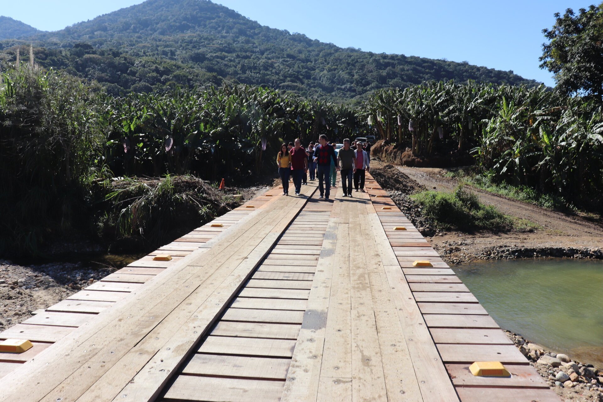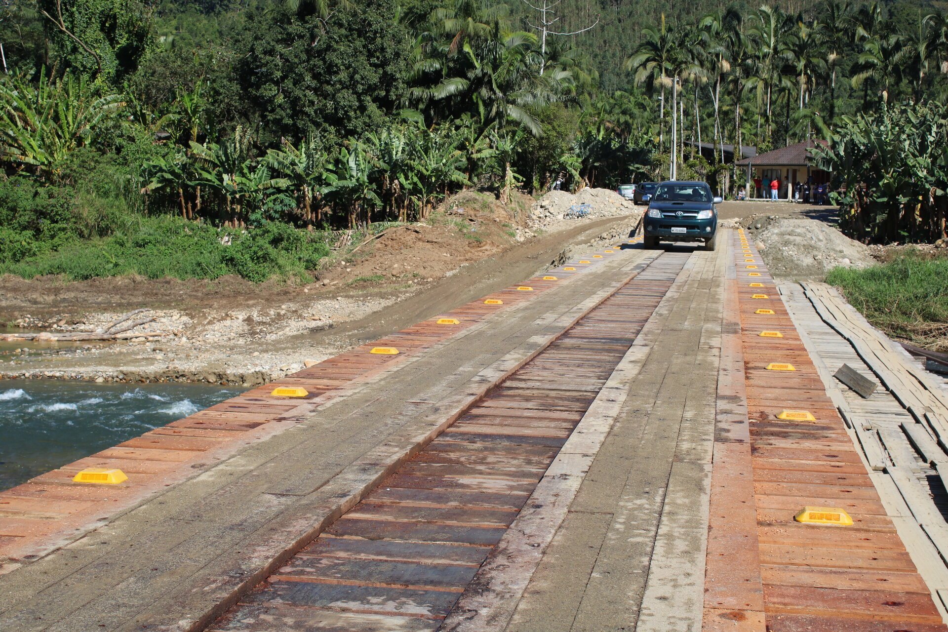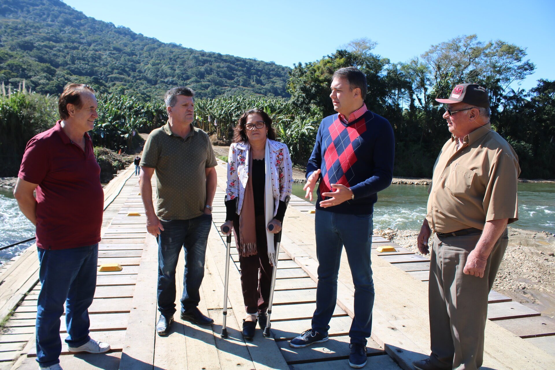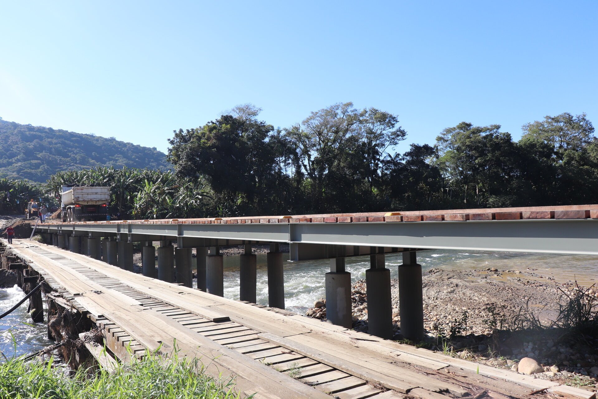 A nova ponte sobre o rio Cubatão foi aberta ao tráfego na manhã desta terça-feira (16). O prefeito Roberto Justus e o agricultor João Stolf fizeram simbolicamente a primeira travessia com a caminhonete do bananicultor.