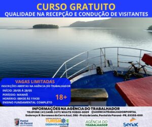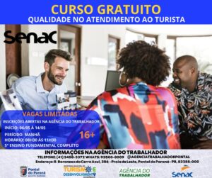 Estão abertas as inscrições na Agência do Trabalhador de Pontal do Paraná para dois cursos gratuitos que vão qualificar 50 jovens da cidade na área de turismo. As aulas serão ministradas por instrutores do Serviço Nacional de Aprendizagem Comercial (Senac-PR) na sede da agência, das 8h às 12h.