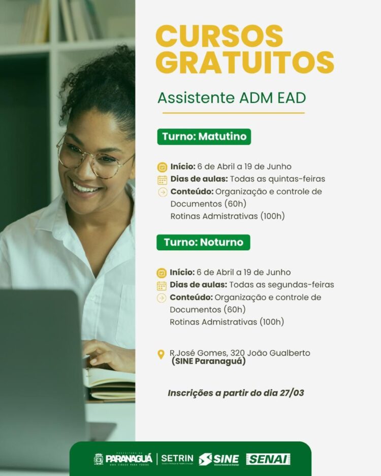 A Prefeitura de Paranaguá, através da Setrin (Secretaria Municipal de Trabalho e Inovação), promove um curso gratuito de qualificação profissional: assistente administrativo EAD – com turmas pela manhã e à noite.
