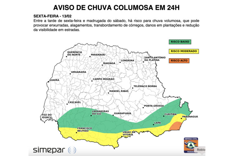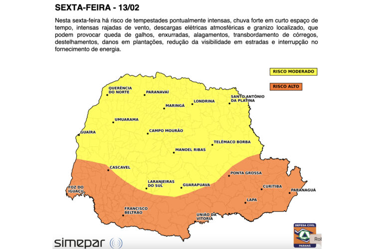 AVISO METEOROLÓGICO – O Boletim de Gestão de Riscos , elaborado pela equipe do Simepar em parceria com a Coordenadoria Estadual de Defesa Civil, aponta nesta sexta-feira (13) risco alto no Leste, Sul e Sudoeste do Paraná, e moderado em todo o resto do Estado, para tempestades pontualmente intensas, chuva forte em curto espaço de tempo, intensas rajadas de vento, descargas elétricas atmosféricas e granizo localizado, que podem provocar queda de galhos, enxurradas, alagamentos, transbordamento de córregos, destelhamentos, danos em plantações, redução da visibilidade em estradas.