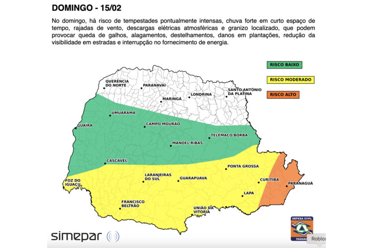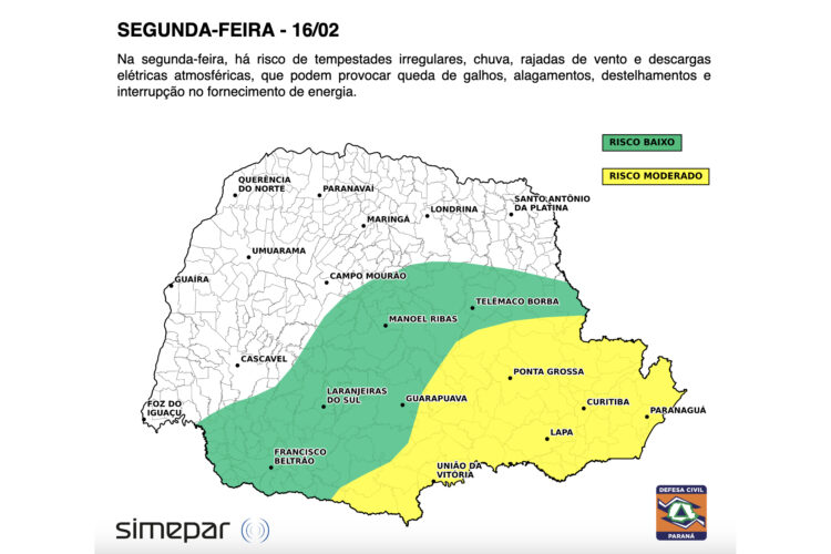Na segunda-feira (16), o Oeste e o Norte estão fora de risco. Segue risco moderado na Região Metropolitana de Curitiba, no Litoral e nos Campos Gerais, e risco baixo no Centro-Sul e Sul do estado, incluindo Telêmaco Borba, Manoel Ribas, Laranjeiras do Sul e Francisco Beltrão.