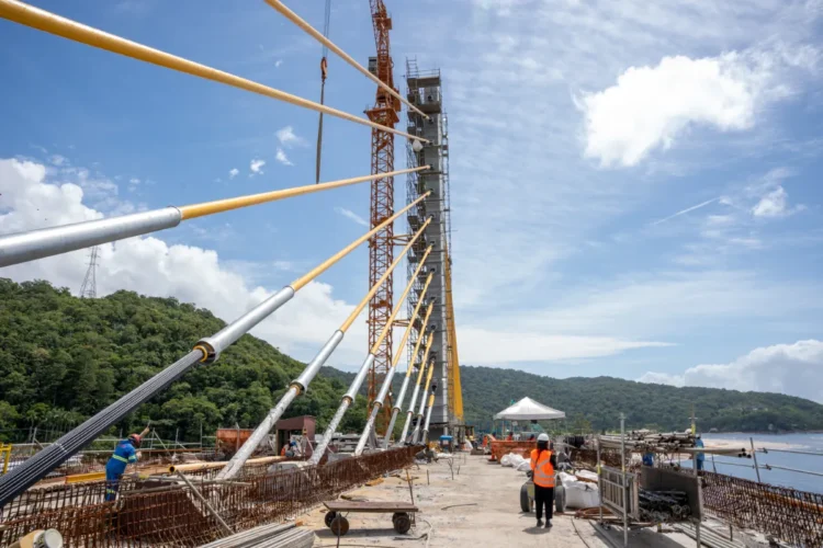 O último estai (cabo de aço de alta resistência tensionado) da Ponte de Guaratuba deve ser instalado no fim de semana, na virada do mês, marcando uma das etapas mais emblemáticas da obra – além do famoso beijo, previsto para acontecer alguns dias depois.